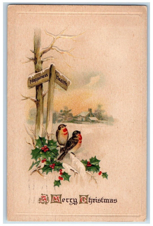 • 1915 Christmas Song Birds Holly Berries Winter Snow Embossed Oneonta NY Postcard