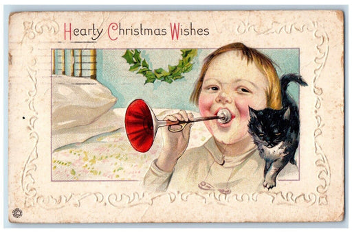 • 1916 Christmas Little Boy Trumpet Black Cat Holly Leaf Embossed Antique Postcard