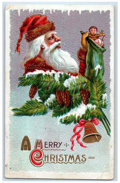 • c1910's Christmas Santa Claus Stockings Full Of Toys Pine Cone Bell Postcard