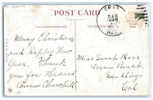 • Christmas Santa Claus Holly Whreat Red Ribbon Embossed Posted Antique Postcard