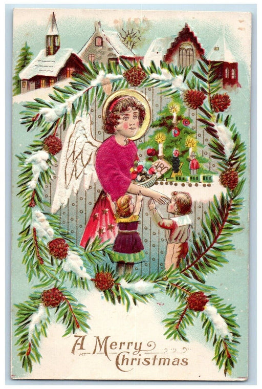 • c1910's Christmas Tree Angel Children Pine Cone Snow Silk House Winter Postcard