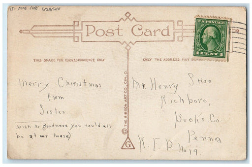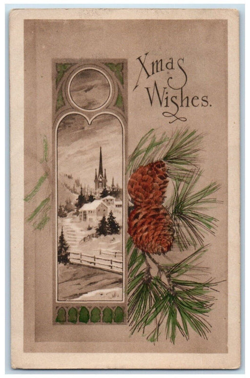 • c1910's Christmas Wishes Pine Cones House Church Winter Snow Gibson Postcard