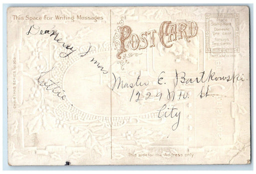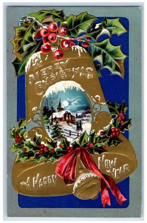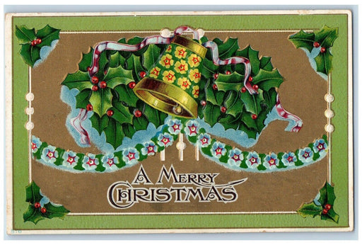 • 1910 Christmas Holly Berries Garland Flower Bells Embossed Antique Postcard