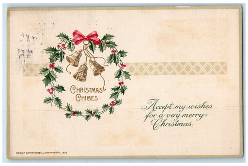• 1915 Christmas Chimes Whreat Bells John Winsch Artist Signed Embossed Postcard