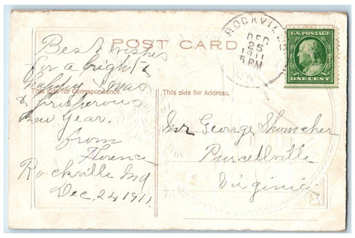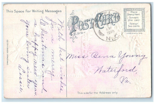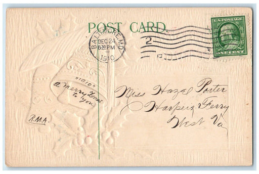 • 1910 Christmas Holly Leaf Large Letters Embossed Manassas VA Antique Postcard