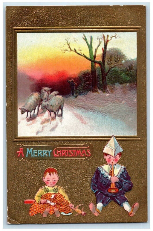 • 1909 Christmas Lamb Boy Girl Flute Winter Snow Embossed Posted Antique Postcard