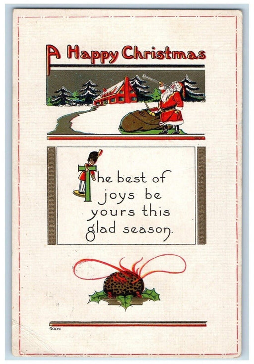 • 1917 Christmas Plum Pudding Santa Claus Sack Of Toys Pine Trees Antique Postcard