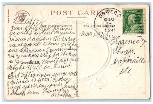 • 1911 Christmas Pine Leaf Candles House Covered Snow Embossed Antique Postcard